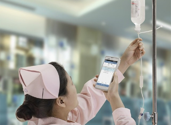 3、护士在对病人的药品进行确认,可以利用医疗智能手持终端PDA来显示的病人所需的药品信息,护士摆药完成后,可将同组药品贴上同一张标签并送入静配室;在患者需要用药时,护士可以使用医疗智能手持终端PDA进行病人药品数量、病区药品数量总体核对,核对通过,打印条码,扫描录入系统,进入送药状态。